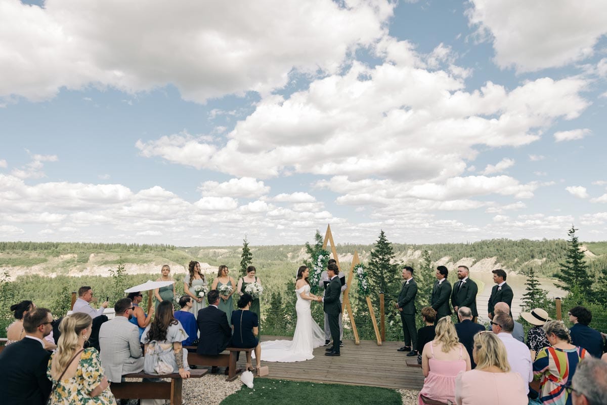 Just 30 minutes southwest of Edmonton in the town of Devon, River’s Edge delivers a perfect blend of modern rustic elegance and jaw-dropping natural beauty. Perched high above the North Saskatchewan River, the ceremony site offers panoramic views of the river valley, framed by mature evergreens and rolling hills. Standing at the altar, couples and their guests feel like they’re on top of the world, with the river winding peacefully below.