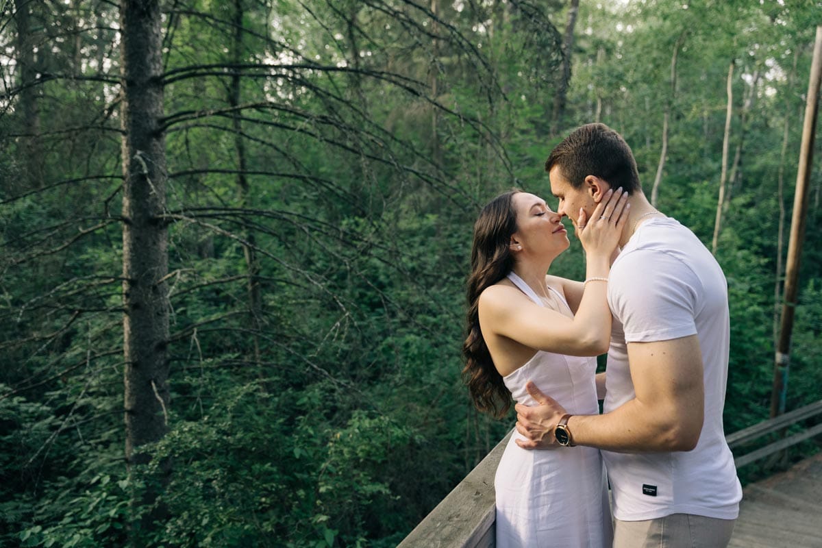 This is my favorite way to build comfort. An engagement shoot is low-pressure—no timeline, just you two exploring Edmonton’s beautiful spots like the River Valley or a cozy cafe. We play, laugh, and get used to being photographed together.